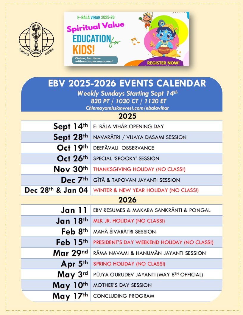 e-Bala Vihar is a fun and interactive weekly program of a world-renowned age-wise curriculum based on Hindu scriptures under the auspices of Chinmaya Mission West. It takes place virtually conducted by Swamins, Brahmacharins, Sevaks, and Youth of Chinmaya Mission. This program is designed for all kids and youth (KG through Grade 12) along with their parents. It is designed to benefit those without easy access to a physical Bala Vihar location (i.e. those living 50 miles or more away from their nearest Chinmaya Mission).